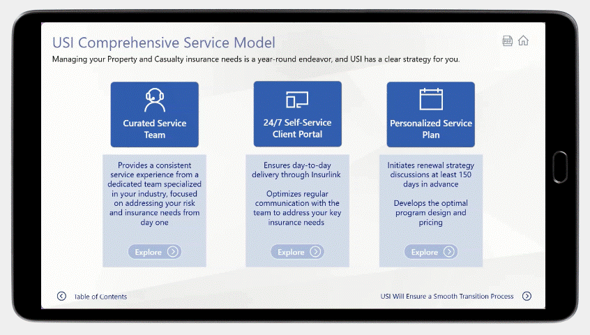 USI delivers a service-first approach to P&C insurance, combining personalized planning, data-driven analysis, and dedicated support to help organizations achieve their risk management and financial goals. To learn more about how USI can support your organization’s success, contact your USI representative or email pcsolutions@usi.com.
